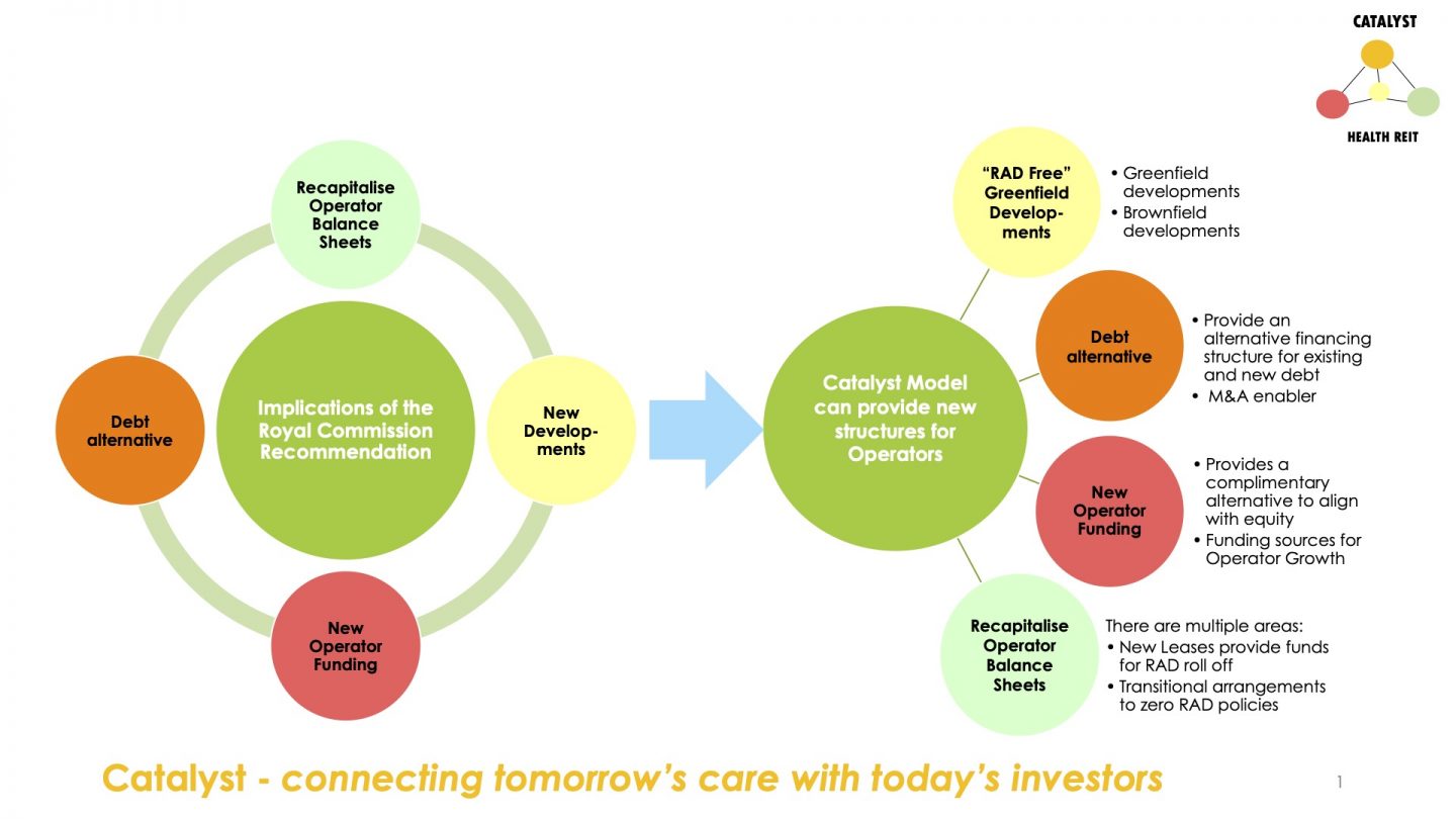 The Catalyst solution is a fundamental change to how debt and equity is structured in the Aged Care industry. Catalyst brings together high-quality operators and motivated long-term investors to benefit tomorrow’s Aged Care residents. With committed funding, we provide innovative, flexible funding solutions that address today’s industry challenges.